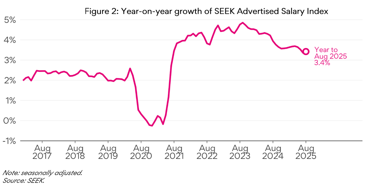 “That said, annual advertised salary growth continues to trend down, dropping 1.4 percentage points on its September 2023 peak. Employment is now growing at a much more typical pace of around 2% annually, compared to the 3% and above recorded in 2023.”