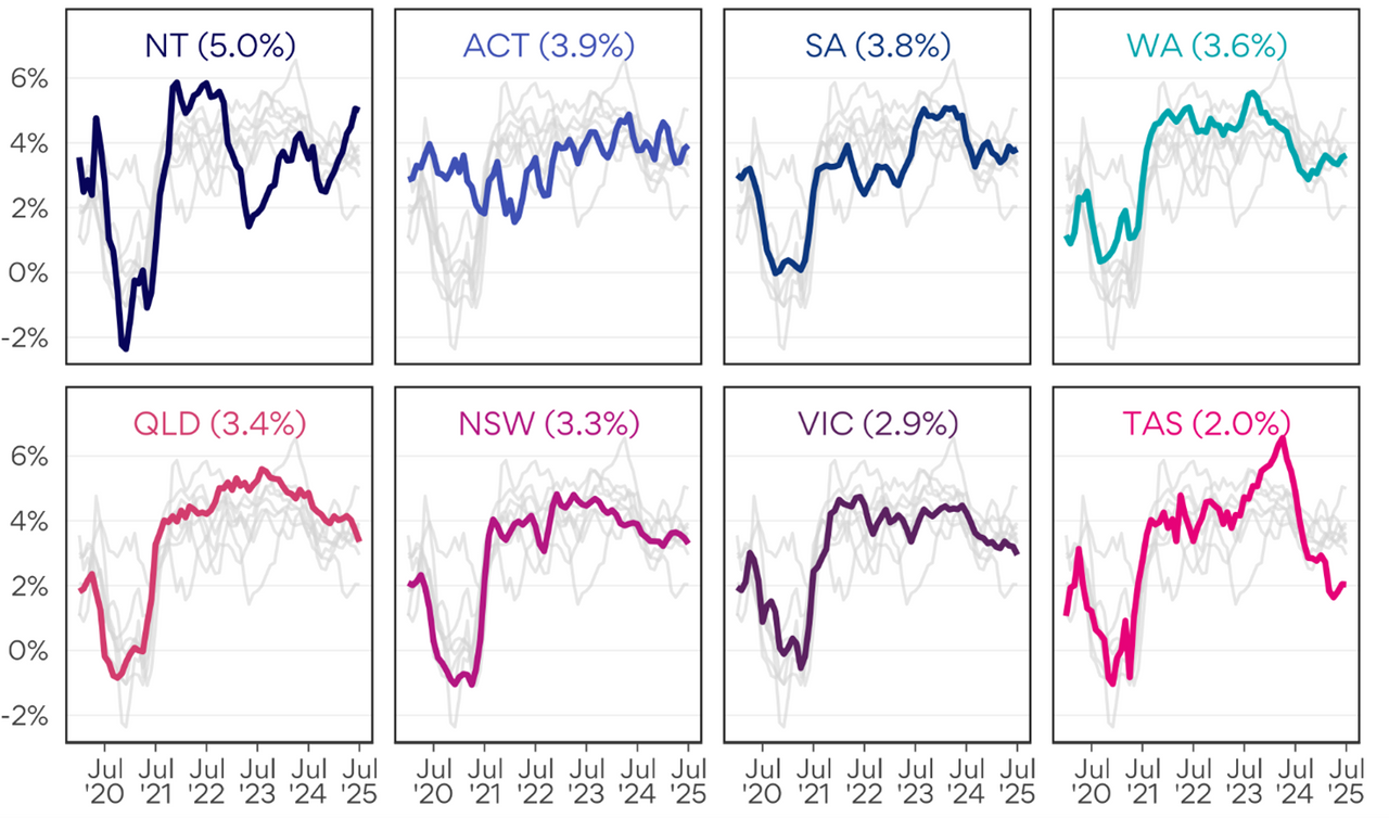 Advertised salary growth has accelerated in the Northern Territory over the past year from 3.5% y/y to 5.0% y/y, The average monthly growth over the first six months of 2025 of 0.5% m/m was four times faster than over the same period of 2024.