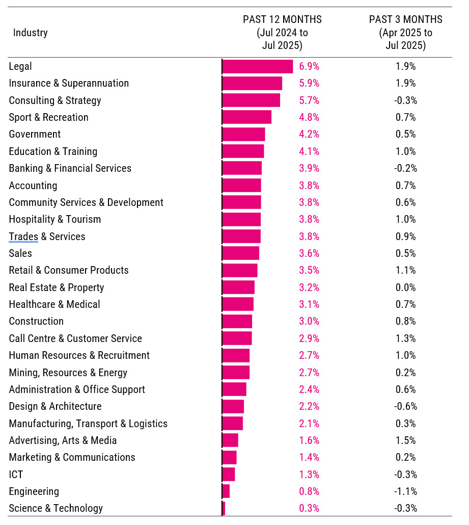 Despite declining over the three months to July, advertised salary growth for Consulting & Strategy has been faster than most industries over the year to July (5.7%). Large declines in advertised salaries for the industry, which were seen at the beginning of 2024, have been replaced by more modest declines this year.