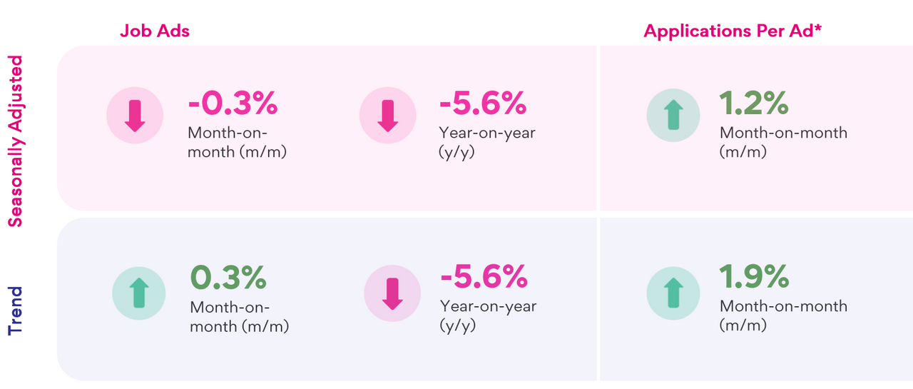 Applications per job ad rose 1.2% m/m, and have grown 4.6% over the past quarter, demonstrating that while ad volumes are stabilising in their decline, candidate appetite for the roles available continues to grow to near-record levels.