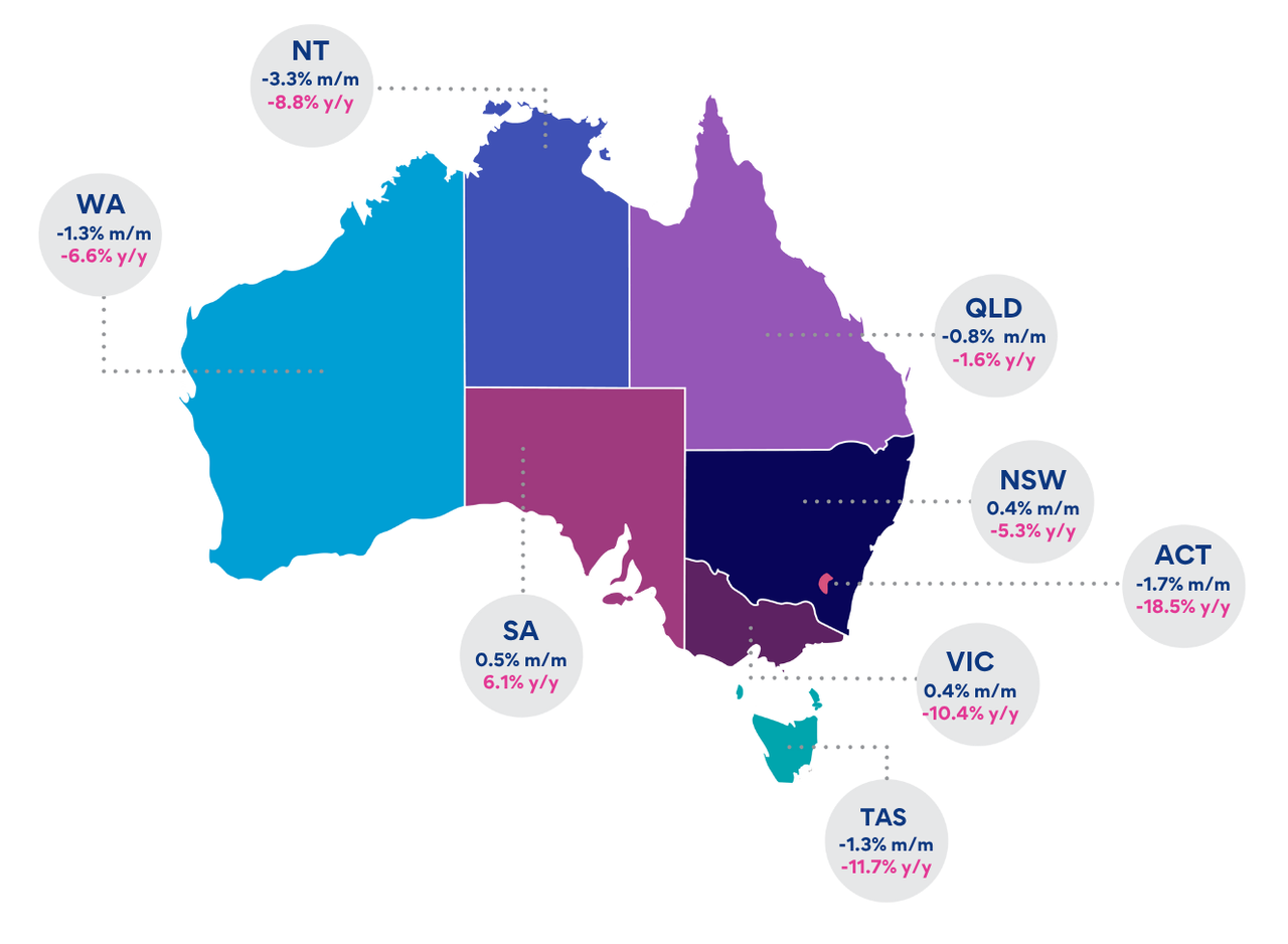 The two territories recorded the largest drops in ad volume for the month, with the Northern Territory down 3.3% and the Australian Capital Territory falling 1.7%.