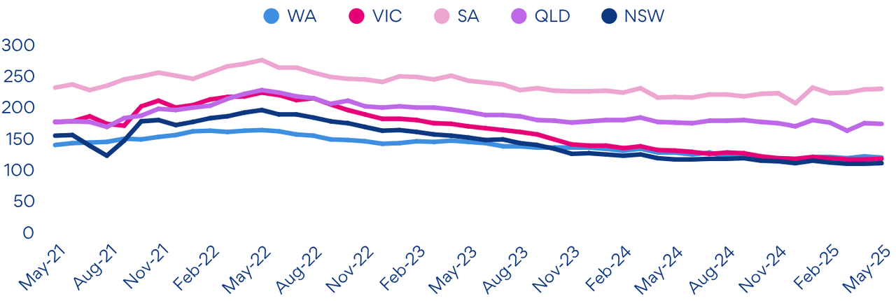 While small, an 0.8% fall in Queensland’s ad volumes drove the national decline in May. This marks a recalibration for the state after greater fluctuation the past two months following Tropical Cyclone Alfred.