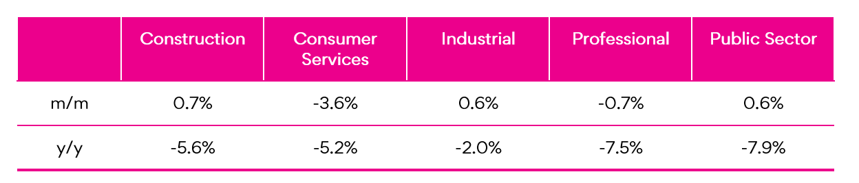 The fastest growing industries were some of the smallest: Consulting & Strategy (5.4% m/m) and Design & Architecture (3.0% m/m).