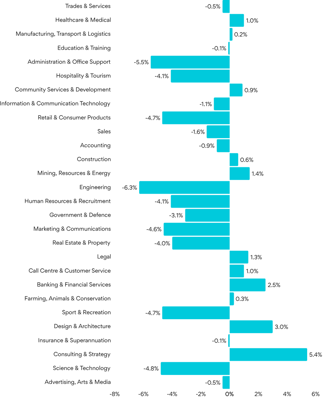 Several smaller industries bucked the national trend, with Consulting & Strategy recording the strongest m/m growth (5.4%), followed by Design & Architecture (3.0%) and Banking & Financial Services (2.5%). Mining, Resources & Energy also posted a modest 1.4% rise.