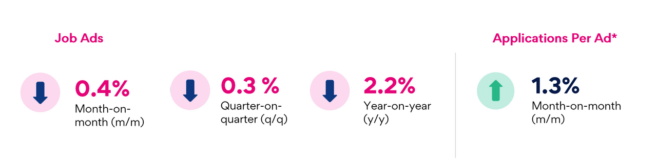 Applications per job ad rose 1.3% m/m.