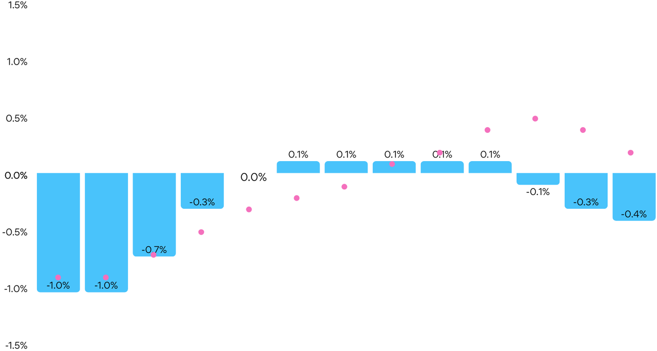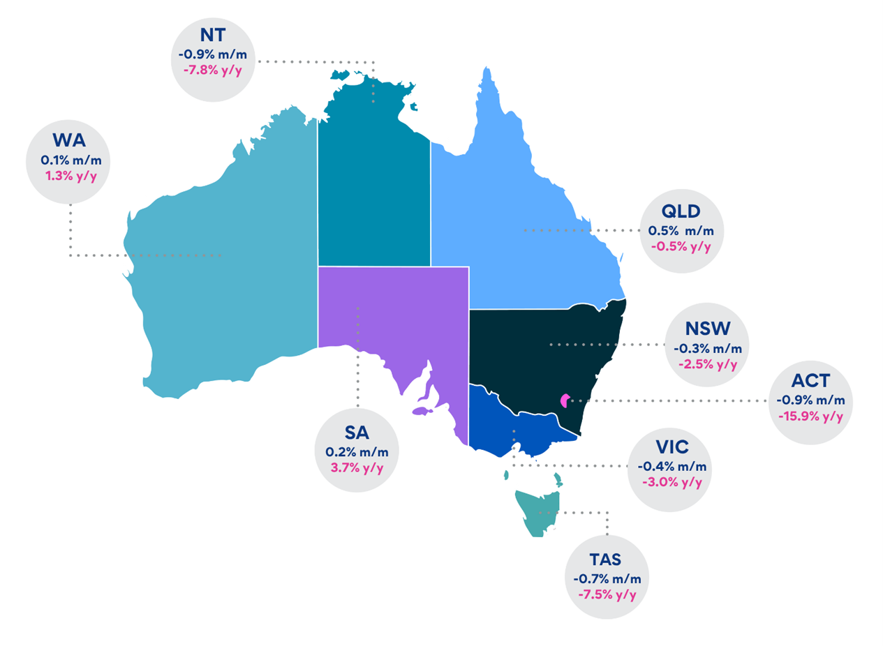 Victoria (-0.4% m/m) and New South Wales (-0.3% m/m) both saw monthly declines.