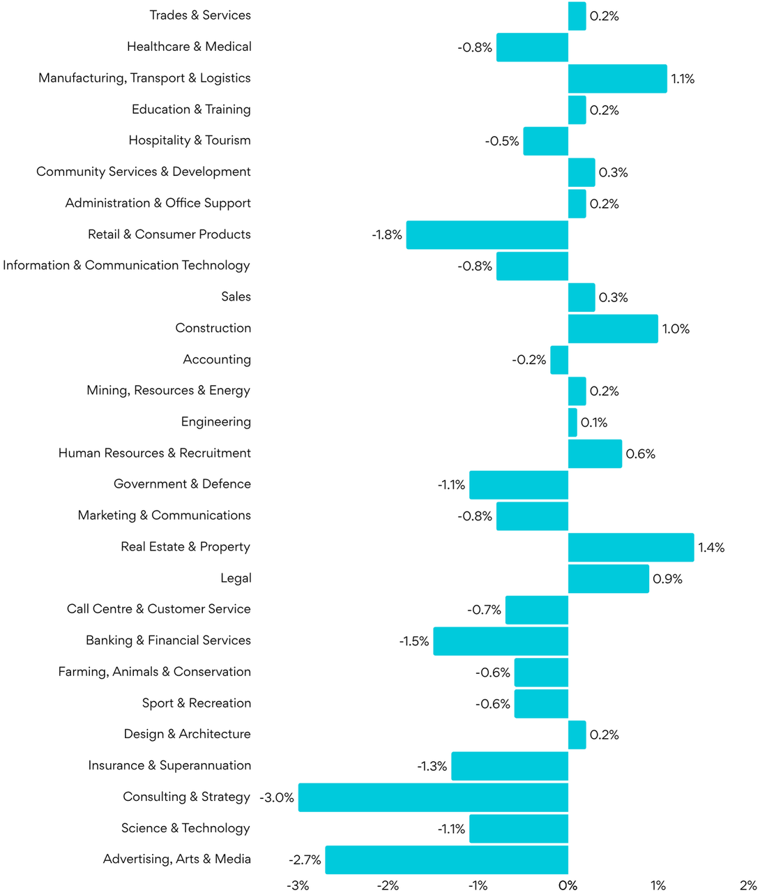 Real Estate & Property jobs grew the fastest m/m, up 1.4%.