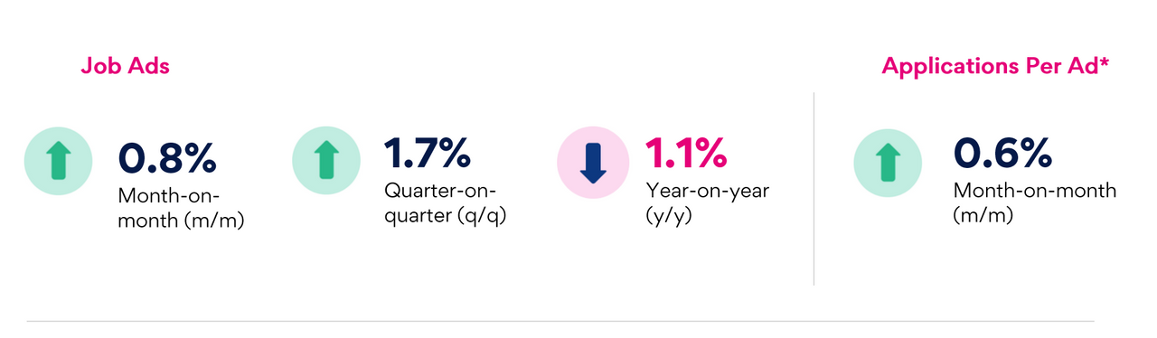 Applications per job ad rose 0.6% m/m and have reached a new peak, demonstrating that candidate interest is persistent even as job ad volumes rise.