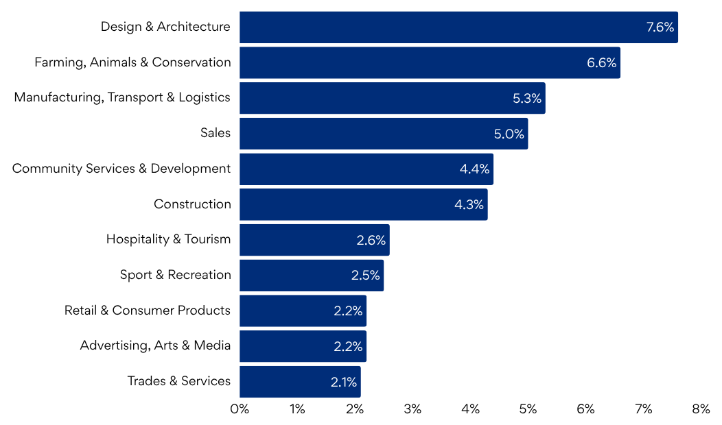 The Trades & Services and Manufacturing, Transport & Logistics industries were the largest contributors to overall job ad growth for the month. Both industries have recorded steadily increasing demand since the start of the year, with modest rises last month.
