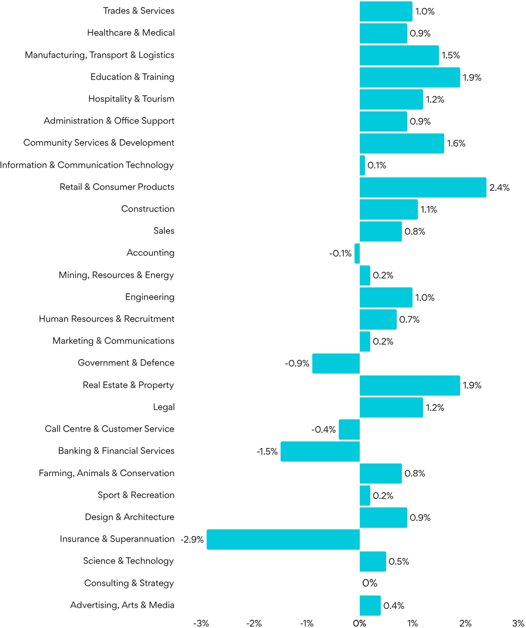 “A number of industries are demonstrating growth, notably within the larger hirers such as Trades & Services and Manufacturing, Transport & Logistics. However, some areas within the Professional Services sector remain under pressure, with Insurance & Superannuation down 2.9% and Banking & Financial Services declining for the fifth consecutive month.