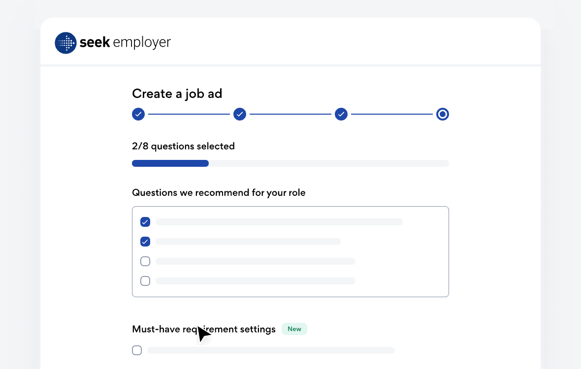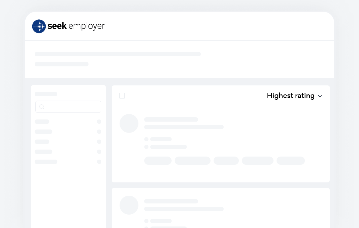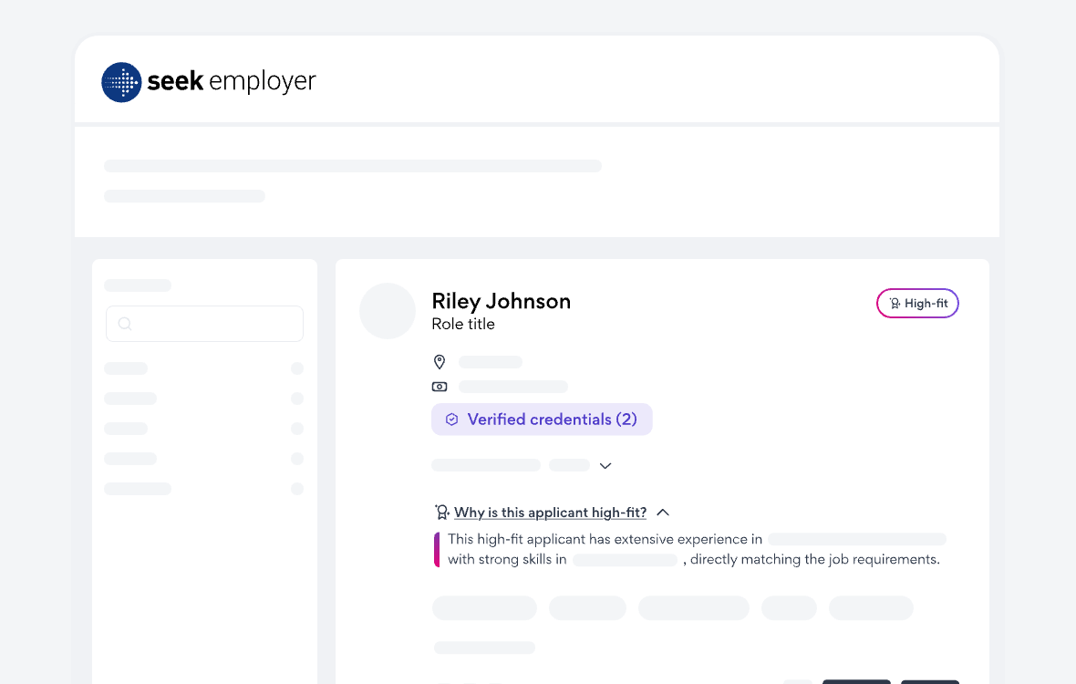 SEEK AI analyses millions of real‑world shortlisting decisions and draws on data from profiles, CVs, and job ads to identify your strongest matches. These high‑fit candidates are three times more likely¹ to be shortlisted and include an AI‑generated summary that clearly explains why they’re a great fit for your role. This added insight helps you hire faster, build trust in your shortlisting decisions, and make confident choices about who to progress.