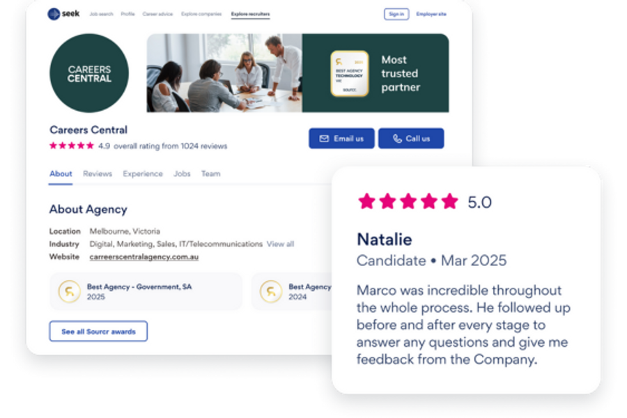 Your Recruiter Profile is a dedicated space on SEEK to showcase your verified reviews, star ratings, past placements, awards, and live job opportunities.