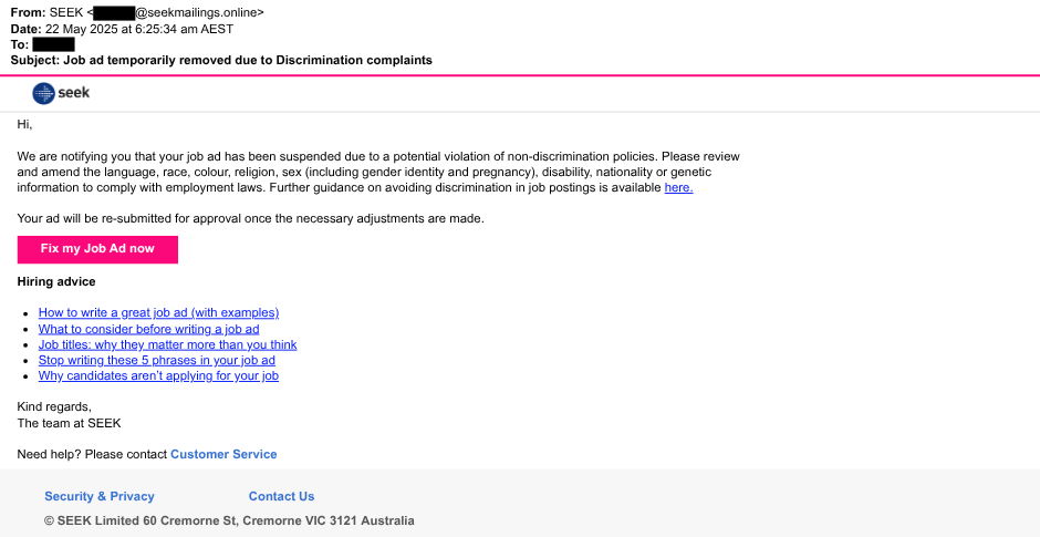 Summary: Scammers impersonate SEEK and send phishing emails that claim the employer’s job ad has been suspended due to a potential violation of non-discrimination policies. The email urges recipients to click a “Fix my Job Ad now” button, which leads to a phishing site designed to steal SEEK account credentials.